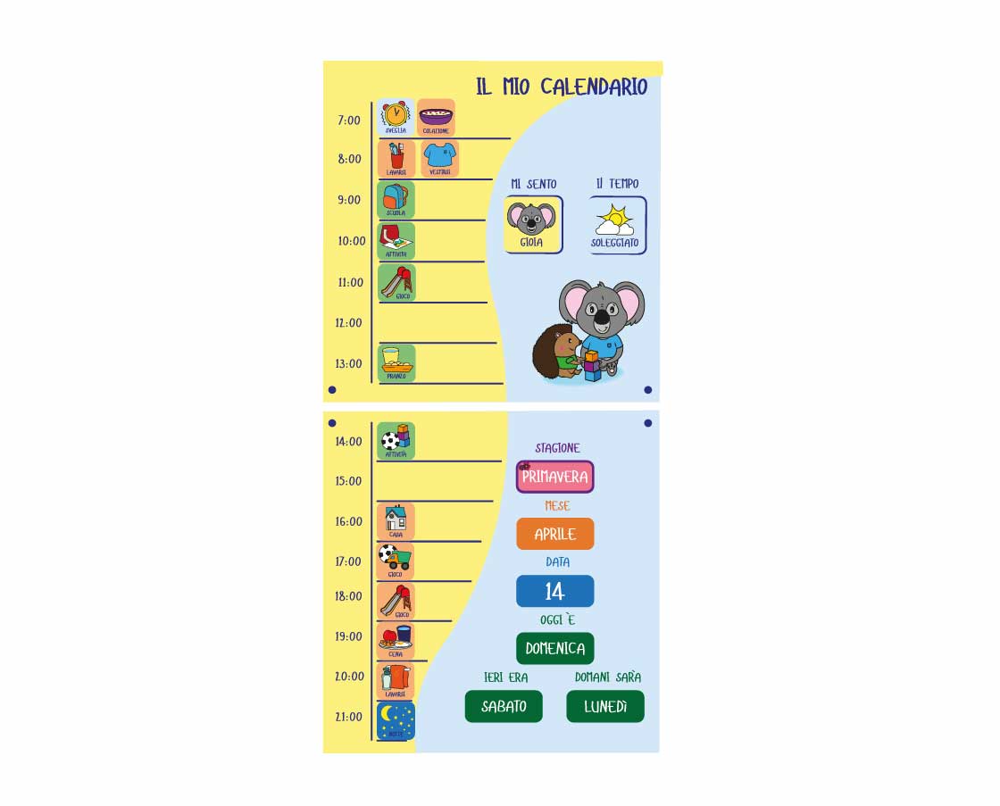 supportando l'apprendimento delle attività giornaliere. Il packaging coordinato include un calendario
